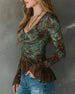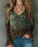 SPECIFIKATIONER Top type: Bluser Stil: Afslappet Materiale: Bomuldsblanding Lejlighed: Daglig Halsudskæring: V-udskæring Mønstertype: Tryk Ærmetype: Pjuskærmer Ærmelængde: Langærmet Pasform: Almindelig Sæson/årstid: Forår,Sommer Detaljer: Pjusket,Rynket Pakken inkluderer: 1 x Bluse STØRRELSESTABEL (cm) Størrelse Buste Længde S 97 65 M 10...