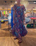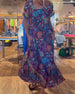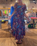 Lang mønstret kjole med halve ærmer og V-udskæring