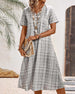 SPECIFIKATIONER Stil: Afslappet Materiale: Bomuldsblanding Kjoletype: A-linje Kjolelængde: Midi Halsudskæring: V-udskæring Mønstertype: Ternet Ærmetype: Almindeligt ærme Ærmelængde: Kortærmet Detaljer: Lomme,Knapper Pasform: Almindelig Sæson/årstid: Forår,Sommer Lejlighed: Daglig Pakken inkluderer: 1 x Kjole STØRRELSESTABEL (cm) Størrelse Bu...