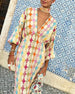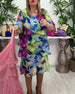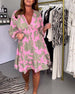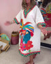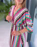 Farverigt mønstret kjole med V-hals og trekvarte ærmer