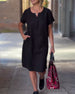 SPECIFIKATIONER Stil: Afslappet Materiale: Bomuldsblanding Kjoletype: Shift-kjole Kjolelængde: Over knæet Halsudskæring: V-udskæring Mønstertype: Ensfarvet Ærmetype: Almindeligt ærme Ærmelængde: Trekvartærmet Detaljer: Lomme, Knapper Pasform: Almindelig Sæson/årstid: Forår, Sommer Lejlighed: Daglig Pakken inkluderer: 1 x Kjole STØRRELSESTA...