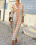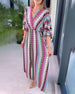 SPECIFIKATIONER Stil: Ferie,Elegant Materiale: Bomuldsblanding Kjoletype: A-linje Kjolelængde: Maxi Halsudskæring: V-udskæring Mønstertype: Geometrisk tryk Ærmetype: Lanterneærmet Ærmelængde: Trekvartærmet Detaljer: Patchwork,Rygløs Pasform: Løs Sæson/årstid: Forår,Sommer,Efterår Lejlighed: Daglig,Ferie Pakken inkluderer: 1 x Kjole STØRREL...