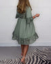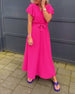 Ensfarvet lang kjole med flæseærmer og bindebånd