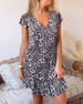 V-halset kjole med leopardprint og flæser