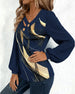 SPECIFIKATIONER Top type: Bluser Stil: Afslappet Materiale: 97% Polyester, 3% Spandex Lejlighed: Daglig, Ferie Halsudskæring: V-udskæring Mønstertype: Tryk Ærmetype: Almindeligt ærme Ærmelængde: Langærmet Pasform: Almindelig Sæson/årstid: Forår, Sommer Pakken inkluderer: Bluse STØRRELSESTABEL (cm) Størrelse Buste Længde Ærmer Skuld...