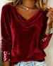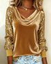 SPECIFIKATIONER Top type: Toppe Stil: Afslappet Materiale: Fløjl Lejlighed: Daglig Halsudskæring: Draperet Krave Mønstertype: Pailletter Ærmetype: Almindeligt ærme Ærmelængde: Langærmet Pasform: Almindelig Sæson/årstid: Efterår,Vinter Pakken inkluderer: 1 x Top STØRRELSESTABEL (cm) Størrelse Buste Længde S 97 65 M 101 66.5 L 105 68 X...