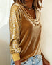 SPECIFIKATIONER Top type: Toppe Stil: Afslappet Materiale: Bomuldsblanding Lejlighed: Daglig Halsudskæring: V-udskæring Mønstertype: Pailletter Ærmetype: Almindeligt ærme Ærmelængde: Langærmet Pasform: Almindelig Sæson/årstid: Efterår,Vinter Pakken inkluderer: 1 x Top STØRRELSESTABEL (cm) Størrelse Buste Længde S 97 65 M 101 66.5 L 105...