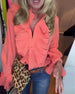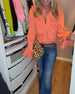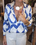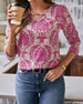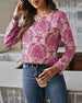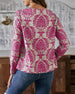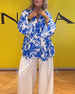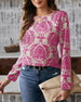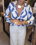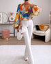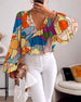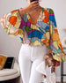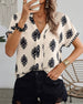 SPECIFIKATIONER Top type: Bluser Stil: Afslappet Materiale: 100% Polyester Lejlighed: Daglig Halsudskæring: V-udskæring, Ståkrave Mønstertype: Tryk Ærmetype: Vidærmet Ærmelængde: Langærmet Pasform: Løs Sæson/årstid: Forår, Sommer Detaljer: Knapper, Rynket Pakken inkluderer: Bluse STØRRELSESTABEL (cm) Størrelse Buste Længde Ærme...