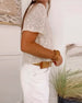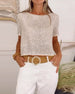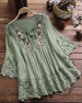 SPECIFIKATIONER Top type: Bluser Stil: Afslappet Materiale: Bomuldsblanding, Lejlighed: Daglig Halsudskæring: Rund hals Mønstertype: Blomster-(garment type),Ensfarvet Ærmetype: Almindeligt ærme Ærmelængde: Trekvartærmet Pasform: Almindelig Sæson/årstid: Sommer Detaljer: Blonder, hulmønstring Pakken inkluderer: 1 x Bluse STØRRELSESTABEL (cm...