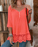 SPECIFIKATIONER Top type: Bluser Stil: Afslappet Materiale: Bomuldsblanding Lejlighed: Daglig Halsudskæring: V-udskæring Mønstertype: Ensfarvet Ærmetype: Almindeligt ærme Ærmelængde: Trekvartærmet Pasform: Almindelig Sæson/årstid: Forår, Sommer Detaljer: Knapper, Udhulende Pakken inkluderer: Bluse STØRRELSESTABEL (cm) Størrelse Buste Læ...