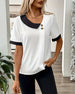 SPECIFIKATIONER Top type: T-shirt Stil: Afslappet Materiale: Bomuldsblanding Lejlighed: Daglig Halsudskæring: Skrå Krave Mønstertype: Farveblok Ærmetype: Almindeligt ærme Ærmelængde: Kortærmet Pasform: Almindelig Sæson/årstid: Forår,Sommer Detaljer: Knapper Pakken inkluderer: 1 x T-shirt STØRRELSESTABEL (cm) Størrelse Buste Længde S 97 65 ...