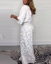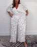 SPECIFIKATIONER Stil: Afslappet Top type: Bluser Materiale: Bomuldsblanding Mønstertype: Tryk Halsudskæring: V-udskæring Ærmetype: Drop Shoulder Ærmelængde: Halve ærmer Buksetype: Brede ben Bukselængde: Lang Taljetype: Mellem talje Pasform: Almindelig Sæson/årstid: Sommer Detaljer: Rygløs, Snøre op, Pjusket, Knude, Klippet ud Lejlighed: Dagli...