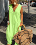 SPECIFIKATIONER Stil: Afslappet Kategori: Jumpsuits Materiale: Bomuldsblanding Mønstertype: Ensfarvet Halsudskæring: V-udskæring Ærmelængde: Uden ærmer Buksetype: Brede ben Bukselængde: Lang Pasform: Almindelig Sæson/årstid: Forår,Sommer Detaljer: Lynlås Lejlighed: Daglig Pakken inkluderer: 1 x Jumpsuits STØRRELSESTABEL (cm) Størrelse B...