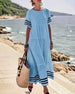 SPECIFIKATIONER Stil: Afslappet Materiale: Bomuldsblanding Kjoletype: Shift-kjole Kjolelængde: Midi Halsudskæring: Rund hals Mønstertype: Farveblok Ærmetype: Almindeligt ærme Ærmelængde: Kortærmet Pasform: Almindelig Sæson/årstid: Forår,Sommer Lejlighed: Daglig Pakken inkluderer: 1 x Kjole STØRRELSESTABEL (cm) Størrelse Buste Længde S...