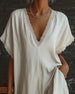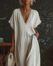 SPECIFIKATIONER Stil: Afslappet Materiale: Bomuldsblanding Kjoletype: Shift-kjole Kjolelængde: Maxi Halsudskæring: V-udskæring Mønstertype: Ensfarvet Ærmetype: Almindeligt ærme Ærmelængde: Kortærmet Detaljer: Snøre Pasform: Almindelig Sæson/årstid: Forår,Sommer Lejlighed: Daglig Pakken inkluderer: 1 x Kjole STØRRELSESTABEL (cm) Størrelse Bus...