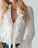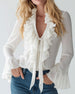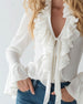 SPECIFIKATIONER Top type: Bluser Stil: Chic Materiale: Bomuldsblanding Lejlighed: Daglig Halsudskæring: V-udskæring Mønstertype: Ensfarvet Ærmetype: Pjuskærmer Ærmelængde: Langærmet Pasform: Almindelig Sæson/årstid: Forår,Sommer,Efterår Detaljer: Pjusket Pakken inkluderer: 1 x Bluse STØRRELSESTABEL (cm) Størrelse Buste Længde S 92 65 M 9...