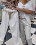 SPECIFIKATIONER Stil: Afslappet Materiale: 100% Polyester Mønstertype: Ensfarvet Buksetype: Brede ben Bukselængde: Lang Taljetype: Høj talje Pasform: Almindelig Sæson/årstid: Forår, Sommer Lejlighed: Daglig, Ferie Pakken inkluderer: Bukser STØRRELSESTABEL (cm) Størrelse Talje Længde Hofte S 62 97 120 M 67 98.5 125 L 72 100...