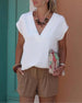 SPECIFIKATIONER Top type: Bluser Stil: Afslappet Materiale: Bomuldsblanding Lejlighed: Daglig Halsudskæring: V-udskæring Mønstertype: Ensfarvet Ærmetype: Almindeligt ærme Ærmelængde: Kortærmet Pasform: Almindelig Sæson/årstid: Sommer Pakken inkluderer: 1 x Bluse STØRRELSESTABEL (cm) Størrelse Buste Længde S 95 65 M 100 66.5 L 105 ...