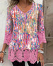 SPECIFIKATIONER Top type: Bluser Stil: Afslappet Materiale: Bomuldsblanding Lejlighed: Daglig Halsudskæring: V-udskæring Mønstertype: Tryk Ærmetype: Almindeligt ærme Ærmelængde: Ni-punkts-ærmer Pasform: Almindelig Sæson/årstid: Forår,Sommer Detaljer: Patchwork,Knapper,Udhulende Pakken inkluderer: 1 x Bluse STØRRELSESTABEL (cm) Størrelse Bust...