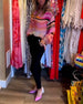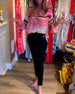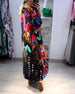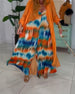 To-delt sæt | Farverigt jumpsuit og orange cardigan