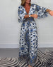 SPECIFIKATIONER Stil: Afslappet, Elegant Kategori: Sæt Materiale: Bomuldsblanding Mønstertype: Tryk Ærmetype: Almindeligt ærme Ærmelængde: Langærmet Buksetype: Brede ben Bukselængde: Lang Pasform: Almindelig Sæson/årstid: Forår, Sommer Lejlighed: Daglig, Ferie Pakken inkluderer: 1 x Jumpsuits, 1 x Cardigan(Bælte medfølger ikke) STØRRELSESTAB...