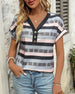 SPECIFIKATIONER Top type: T-shirt Stil: Afslappet Materiale: Bomuldsblanding Lejlighed: Daglig Halsudskæring: V-udskæring Mønstertype: Stribet Ærmetype: Almindeligt ærme Ærmelængde: Kortærmet Pasform: Almindelig Sæson/årstid: Forår,Sommer Pakken inkluderer: 1 x T-shirt STØRRELSESTABEL (cm) Størrelse Buste Længde S 97 68 M 101 69.5 L 10...