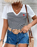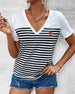 SPECIFIKATIONER Top type: T-shirt Stil: Afslappet Materiale: Bomuldsblanding Lejlighed: Daglig Halsudskæring: V-udskæring Mønstertype: Stribet,Farveblok Ærmelængde: Kortærmet Pasform: Almindelig Sæson/årstid: Forår,Sommer Pakken inkluderer: 1 x T-shirt STØRRELSESTABEL (cm) Størrelse Buste Længde S 97 65 M 101 66.5 L 105 68 XL 111 69....