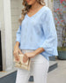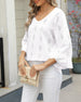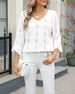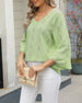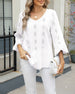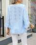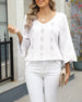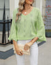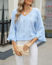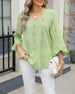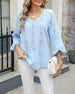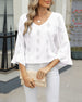 SPECIFIKATIONER Top type: Toppe Stil: Afslappet Materiale: Bomuldsblanding Lejlighed: Daglig Halsudskæring: V-udskæring Mønstertype: Geometrisk tryk Ærmetype: Vidærmet Ærmelængde: Ni-punkts-ærmer Pasform: Almindelig Sæson/årstid: Forår,Sommer Detaljer: Udhulende Pakken inkluderer: 1 x Top STØRRELSESTABEL (cm) Størrelse Buste Ærmer Skulde...