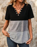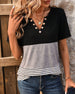 SPECIFIKATIONER Top type: T-shirt Stil: Afslappet Materiale: Bomuldsblanding Lejlighed: Daglig Halsudskæring: V-udskæring Mønstertype: Stribet,Farveblok Ærmetype: Almindeligt ærme Ærmelængde: Kortærmet Pasform: Almindelig Sæson/årstid: Forår,Sommer Detaljer: Knapper Pakken inkluderer: 1 x T-shirt STØRRELSESTABEL (cm) Størrelse Buste Længde ...