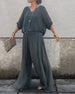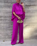 SPECIFIKATIONER Stil: Chic, Elegant Kategori: Sæt Materiale: Bomuldsblanding Mønstertype: Ensfarvet Halsudskæring: Højhalset Ærmetype: Flagermuse-ærmer Ærmelængde: Halve ærmer Buksetype: Brede ben Bukselængde: Lang Taljetype: Høj talje Pasform: Almindelig Sæson/årstid: Forår, Sommer Lejlighed: Daglig, Arbejde Pakken inkluderer: Bluse, 1 x Buk...