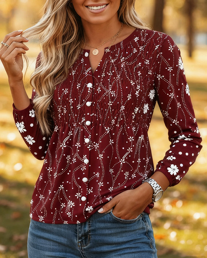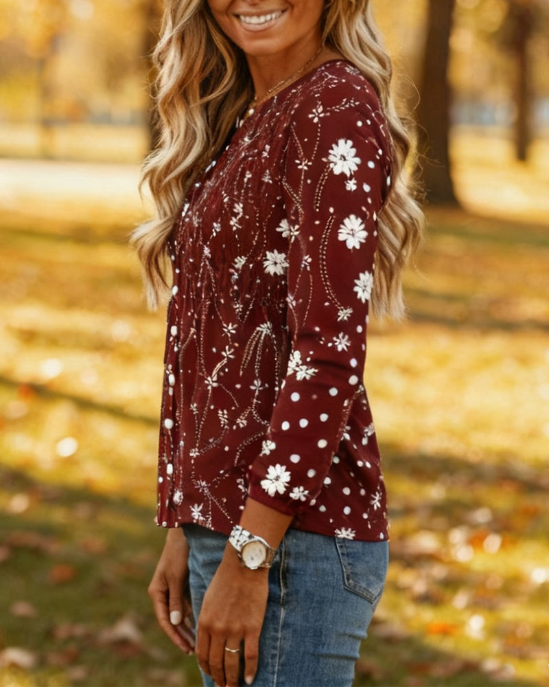 Bluse Retro Trykt V-udskæring