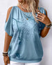 SPECIFIKATIONER Top type: T-shirt Stil: Afslappet Materiale: Bomuldsblanding Lejlighed: Daglig Halsudskæring: Rund hals Mønstertype: Fjer Ærmetype: Kold skulder Ærmelængde: Kortærmet Pasform: Almindelig Sæson/årstid: Forår,Sommer Detaljer: Klippet ud Pakken inkluderer: 1 x T-shirt STØRRELSESTABEL (cm) Størrelse Buste Længde S 97 65 M 101...