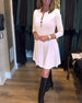 Ensfarvet kjole med V-halsudskæring og blondeærmer