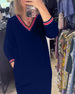 SPECIFIKATIONER Stil: Afslappet Materiale: 5% Spandex, 95% Polyester Kjoletype: Shift-kjole Kjolelængde: Knælængde Halsudskæring: V-udskæring Mønstertype: Stribet Ærmetype: Almindeligt ærme Ærmelængde: Trekvartærmet Detaljer: Lomme Pasform: Almindelig Sæson/årstid: Efterår,Vinter Lejlighed: Daglig Pakken inkluderer: 1 x Kjole STØRRELSESTAB...