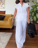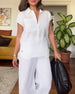 SPECIFIKATIONER Stil: Afslappet Top type: Bluser Kategori: Sæt Materiale: 30% Linned 70% Bomuld Mønstertype: Ensfarvet Halsudskæring: Revers Ærmetype: Almindeligt ærme Ærmelængde: Kortærmet Buksetype: Lige ben Bukselængde: Lang Taljetype: Høj talje Pasform: Almindelig Sæson/årstid: Forår,Sommer Detaljer: Knapper Lejlighed: Daglig Pakken inklu...