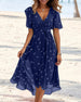 SPECIFIKATIONER Stil: Elegant Materiale: Chiffon,Polyester Kjoletype: A-linje Kjolelængde: Midi Halsudskæring: V-udskæring Mønstertype: Tryk Ærmetype: Almindeligt ærme Ærmelængde: Kortærmet Detaljer: Patchwork, Snøre op Pasform: Almindelig Sæson/årstid: Forår, Sommer, Efterår Lejlighed: Daglig Pakken inkluderer: 1 x Kjole STØRRELSESTABEL ...